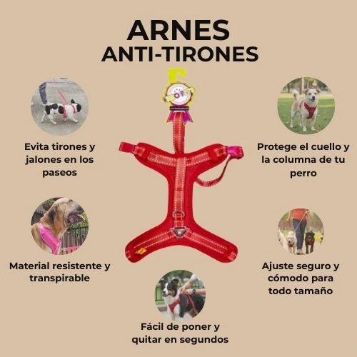 Nuestro Arnés Anti-tirones distribuye la presión de manera uniforme, evitando lesiones en el cuello y logrando paseos más tranquilos y seguros. Además, brinda comodidad total y control sin esfuerzo, mejorando la experiencia para ti y tu perro.